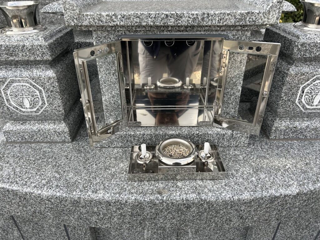 ↑ステンレスで線香・ローソク立てが一体型